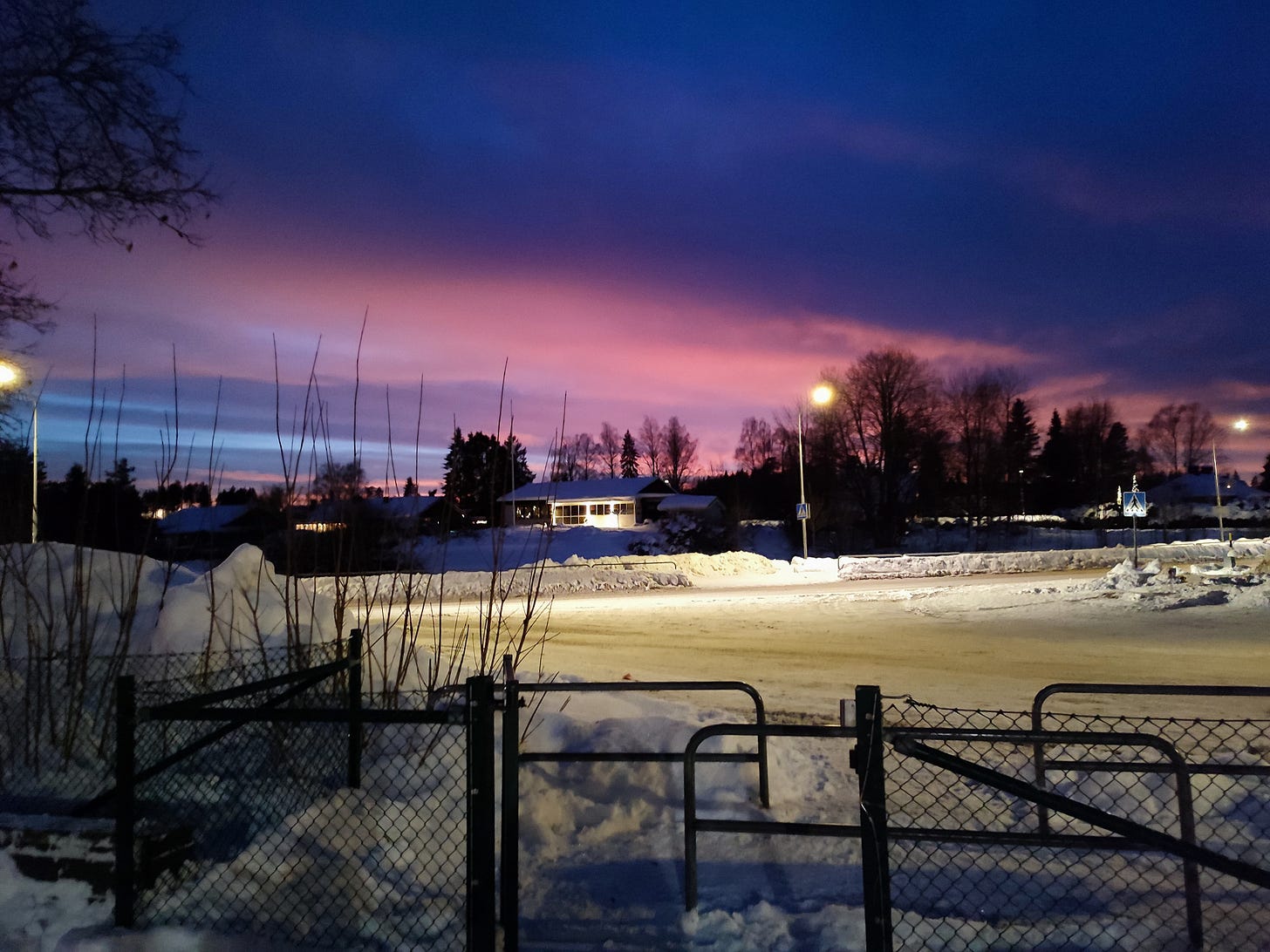 In the meantime, I can’t show you a photo of what meets my gaze here in Ljungskile just now, but here is the view from the school gates, one winter’s afternoon in Östervåla, which was the image on my title slide this morning.
